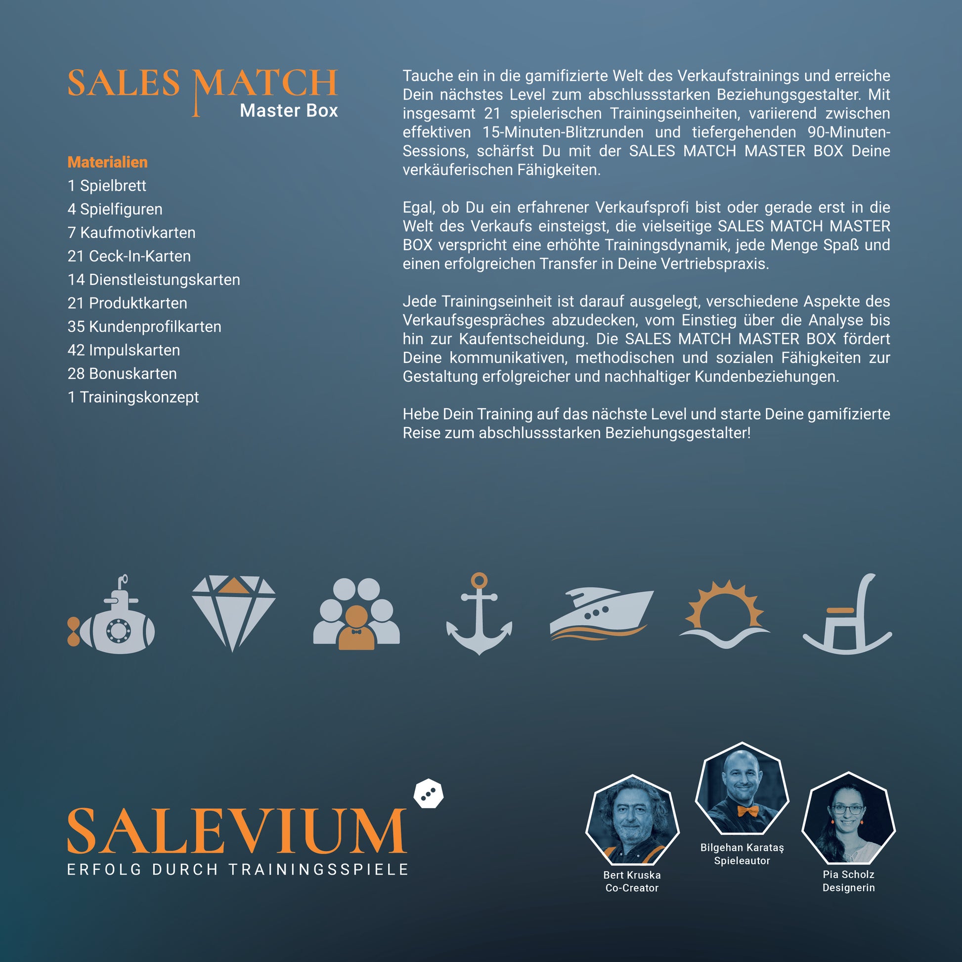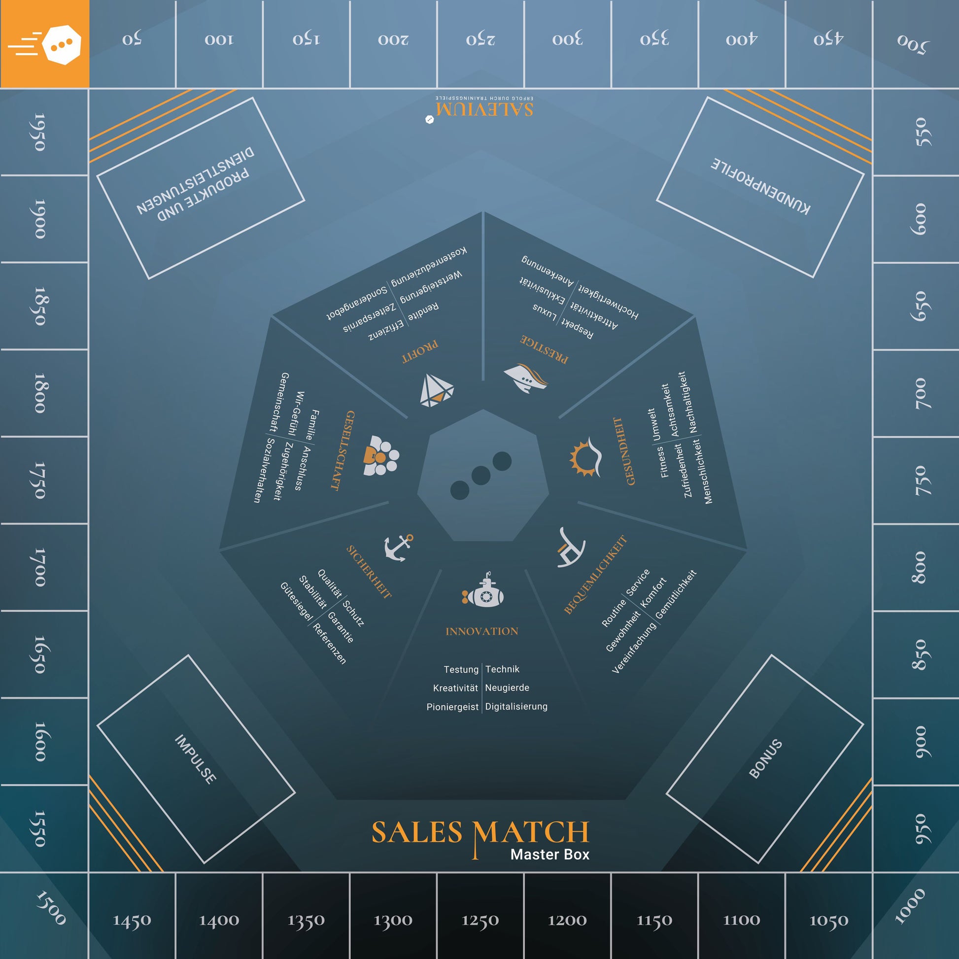 Die SALES MATCH MASTER BOX ist darauf ausgelegt, verschiedene Aspekte des Verkaufsgespräches abzudecken - angefangen bei dem Gesprächseinstieg über die Analyse bis hin zur Kaufentscheidung. Die Trainingsspiele fördern deine kommunikativen, methodischen und sozialen Fähigkeiten zur Gestaltung erfolgreicher und nachhaltiger Kundenbeziehungen.